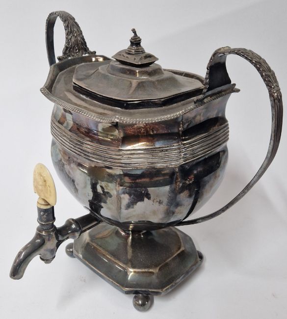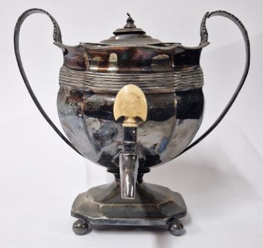 A George III silver dispenser, hallmarked London 1804, with foliate handles (one broken) and ivory tap finial, height approx 23cm, total weight approx 31.85oz. Ivory Licence Number GMJ1HJ8G. From the Estate of the Late Tony Martin.