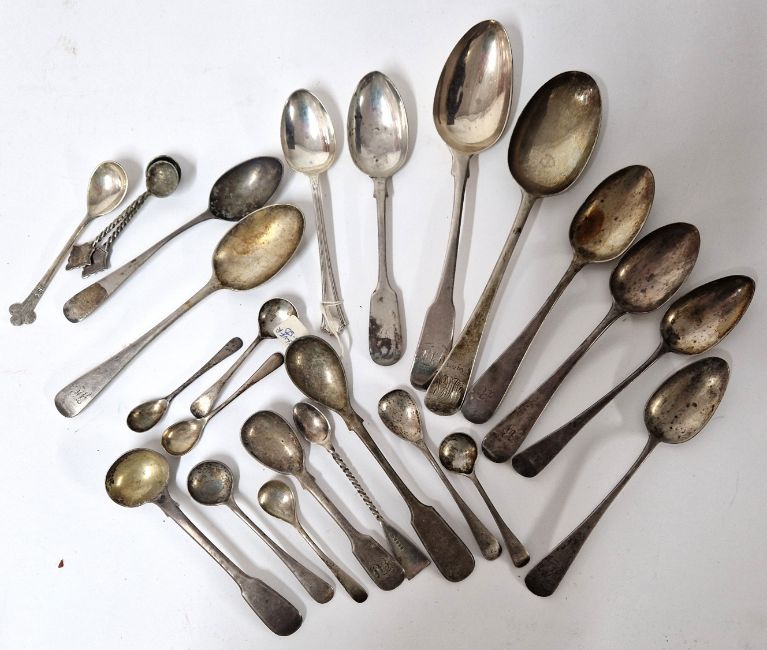 A collection of various silver spoons, to include dessert spoons, teaspoons, mustard spoons, etc, silver weight approx 10.2oz, together with three silver plated mustard spoons. From the Estate of the Late Tony Martin.