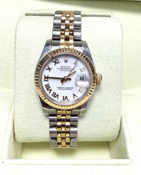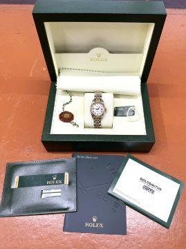 Rolex, a ladies Oyster Perpetual Datejust wristwatch, stainless steel and gold bracelet, Reference 179173, serial Number V280081, purchased 23/02/2013, with guarentee card, tags, booklets, boxed.