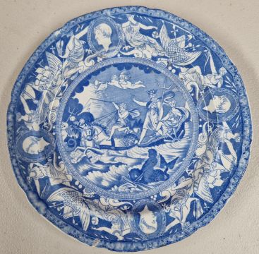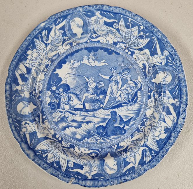 A transfer printed blue and white ceramic plate, decorated with Neptune riding sea horses, with ships and figures in profile to the border, diameter approx 24cm.