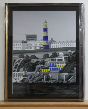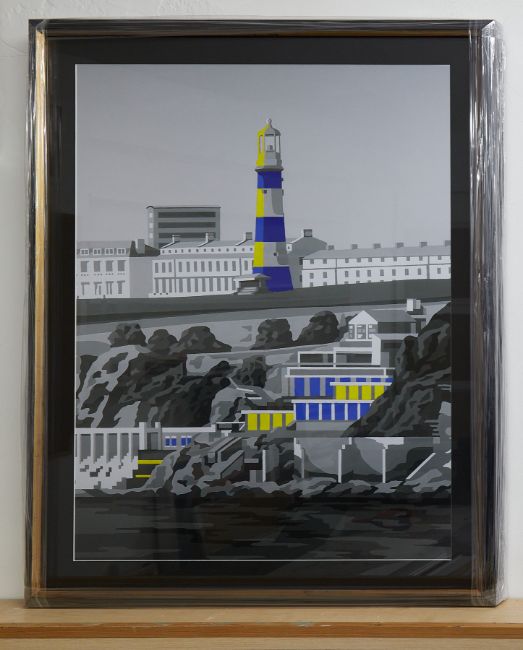 British Acrylic on print by Henry Sells depicting Smeaton's Tower, Plymouth. Henry is a bold and bright artist based in Plymouth.