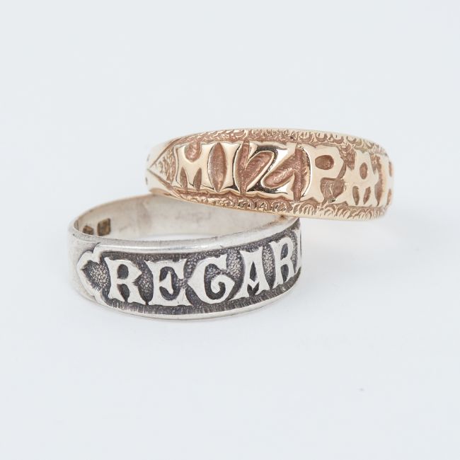 A 9ct yellow gold 'Mizpah' ring, 3.3gm, size R and a silver 'Regard' ring, 2.7gm, size N 1/2, (2).