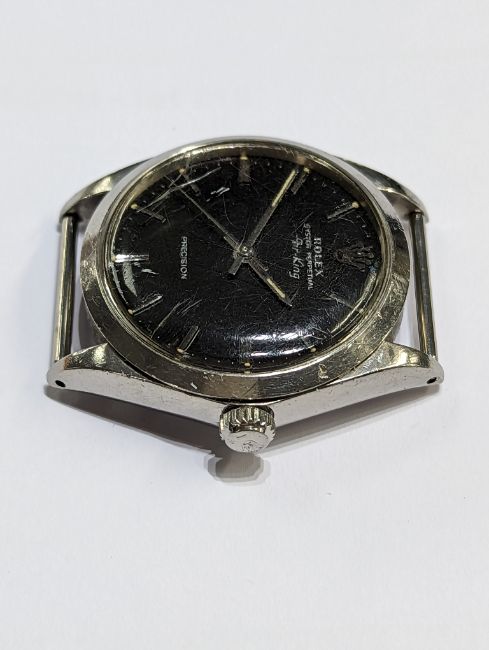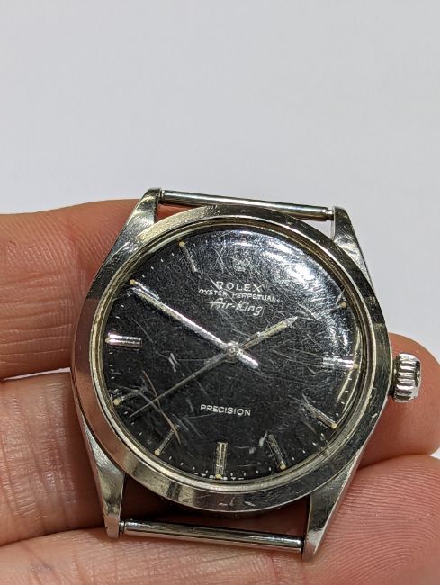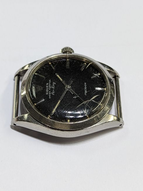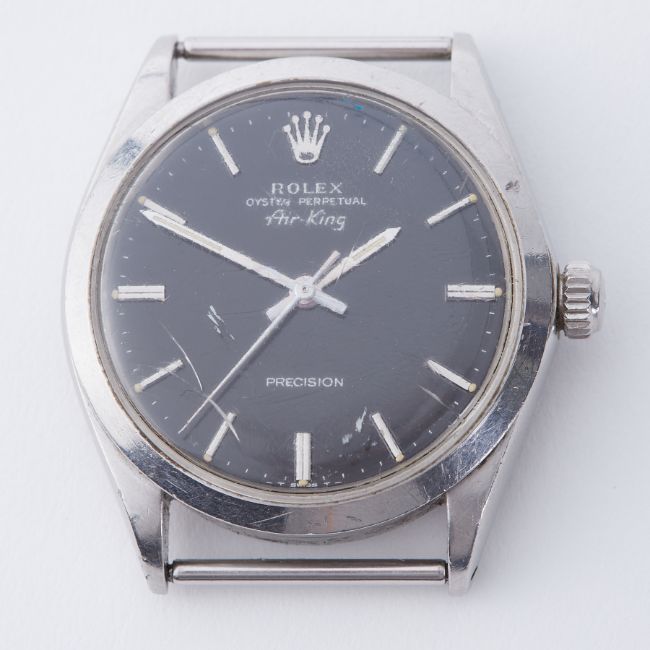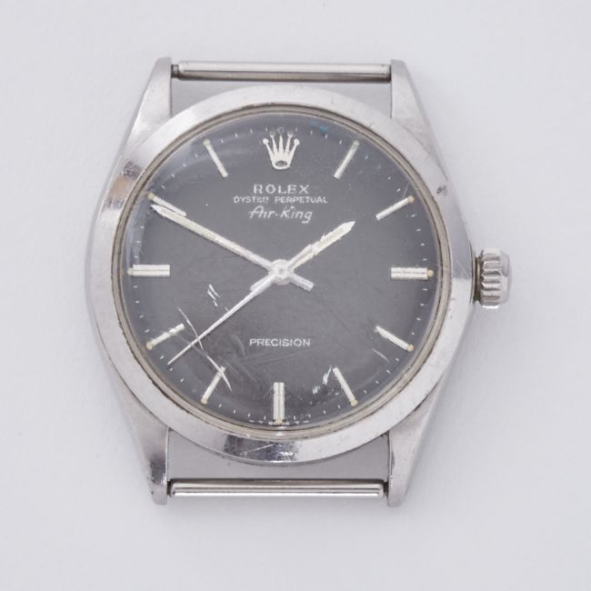 Rolex, a vintage automatic Rolex Oyster Perpetual Air King Precision watch face only, 34mm, black silver baton dial, model number 5500, case number 2108613 (1969), no box or papers, currently not running, glass cracked.