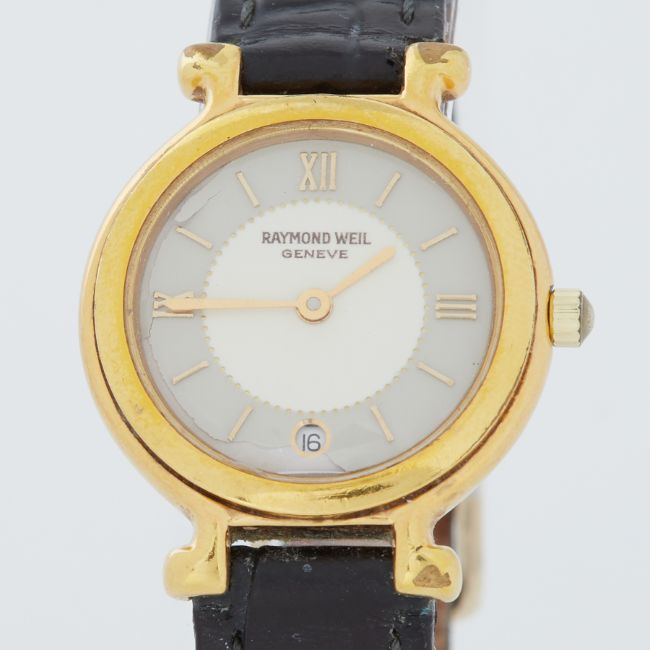 Raymond Weil, a gold plated Raymond Weil wristwatch with date window, stamped on reverse 9936-2, on black leather strap, damage to watch face, no box or papers.