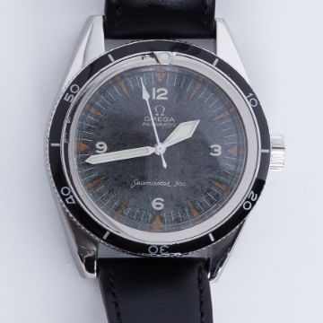 Omega, a 1967 Omega automatic Seamaster 300, rare model, 1/4 arabic, bold arrow baton dial, 38mm, straight lug, black inlay bezel on leather strap, dial original, watch number 50/660, calibre 552, condition - hands, glass, inlay, crown renewed, new Omega strap fitted, box and papers and a copy of the Watch Repair/Service Receipt for £1162.13 from Omega (Omega Boutique Plymouth, Drakes Circus), dated 06/02/2023 which offers a 24 month guarantee (it does not detail the work carried out).Condition reports are offered as a guide only and we highly recommend that you inspect any lot to satisfy yourself as to its condition. Plymouth Auction Rooms do not guarantee the working order or accuracy of any watches sold. Please refer to clause 15 on our terms of business.
