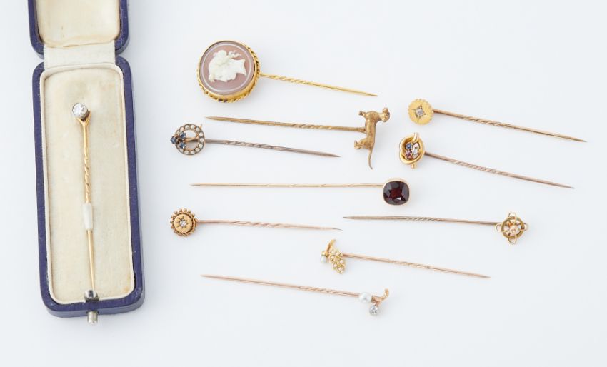 A collection of eleven gold stick pins, including a boxed diamond stick pin, others set with pearls, a cameo, dog, stone set, etc, total weight 18.5gm, (majority not hallmarked or tested).