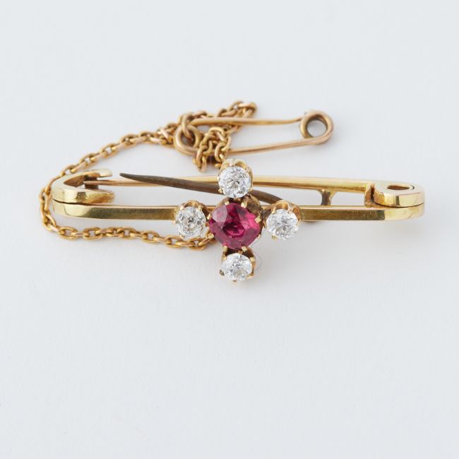 A yellow gold brooch set with a round cut ruby, approx. 0.35 carats and four old rose cut diamonds, total diamond weight approx. 0.40 carats, with double pin fitment & a safety chain, length 3.5cm x 1.2cm, 4.9gm.