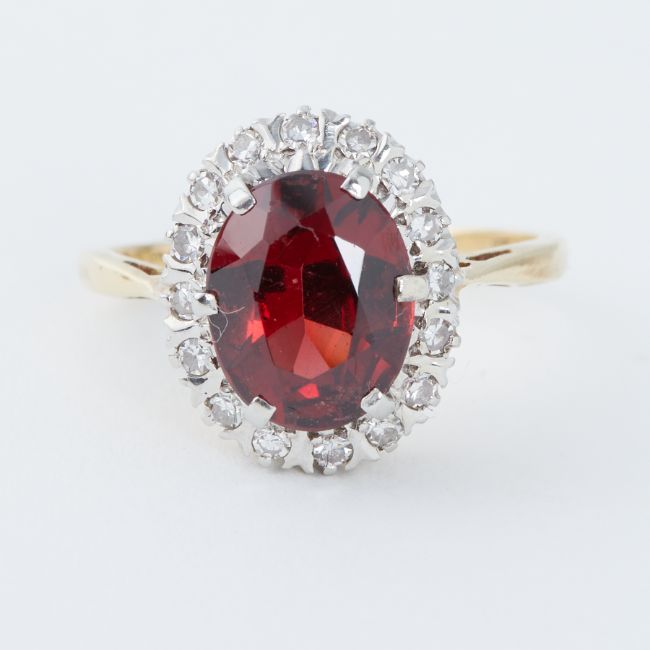 An 18ct yellow & white gold cluster ring set with a central oval cut garnet, approx. 2.23 carats, surrounded by small round single cut diamonds in an illusion setting, total diamond weight approx. 0.08 carats, 4.2gm, size M.