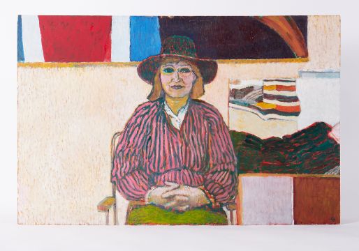 Unframed painting titled 'Barbara in Studio in Black Hat' c.1981, acrylic/board, 61cm x 94cm