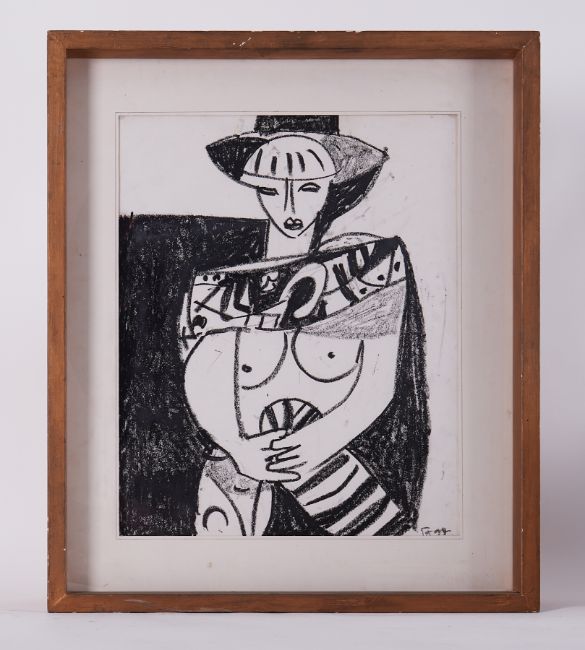 Framed painting - untitled 'Female in B & W' 1994, conte on paper, 69cm x 59cm