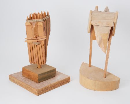 Two wood sculptures 'Big Bird' 1999 and 'Head Study', height approx 38cm (2) On his wooden sculptures, created as Ewart lost his sight due to Retinitis Pigmentosa: "I search in my box of bits for a shape". He turns it over and over, feeling it. "The result gives life to a piece because it's unexpected. There's more life in a bird's head twisted to one side than in something symmetrical. Birds have to look like this.." He twists his neck to demonstrate how a bird inclines its head to perceive an object.