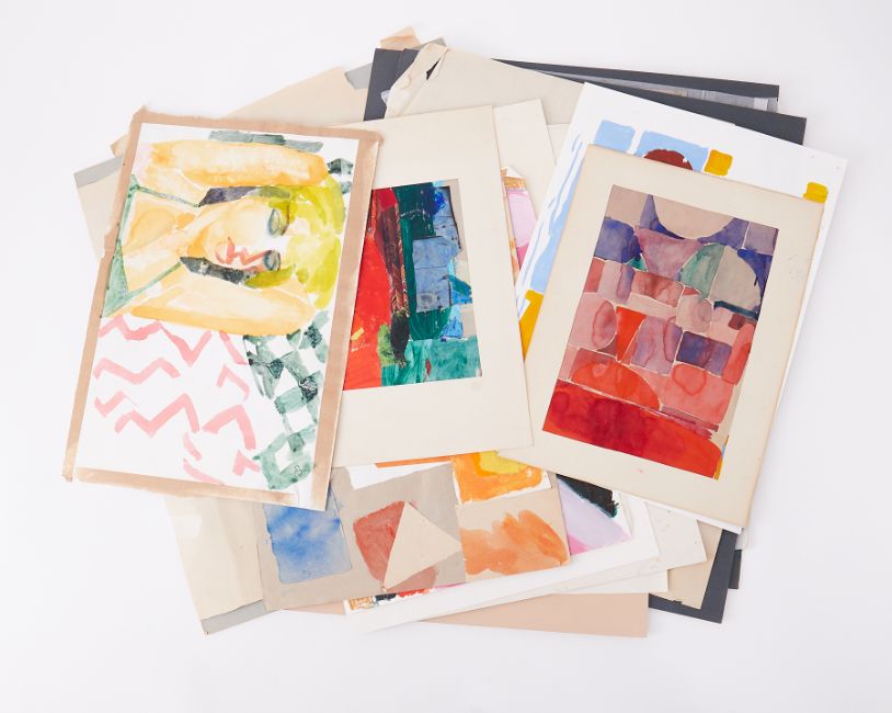 'Red on Blue landscape' 1978 watercolour, mounted, 16 x 22cm, together with a collection of other unframed and various subject watercolours, mixed media and other artworks (16)