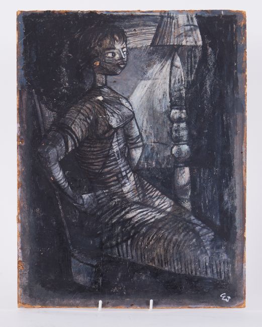 Unframed painting titled 'Girl and Lamp' c.1954, oil on board, 43cm x 33 cm, reverse has rugby players