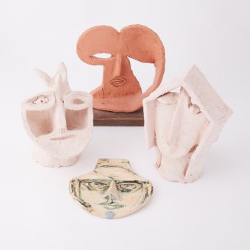 A group of four unglazed clay sculptures, abstract studies, tallest 26cm