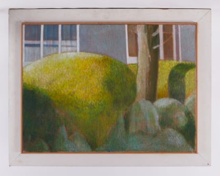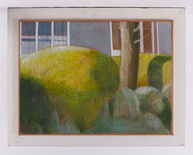 Framed painting titled ' Front garden with Golden Privet' 1980, canvas, 70cm x 91cm