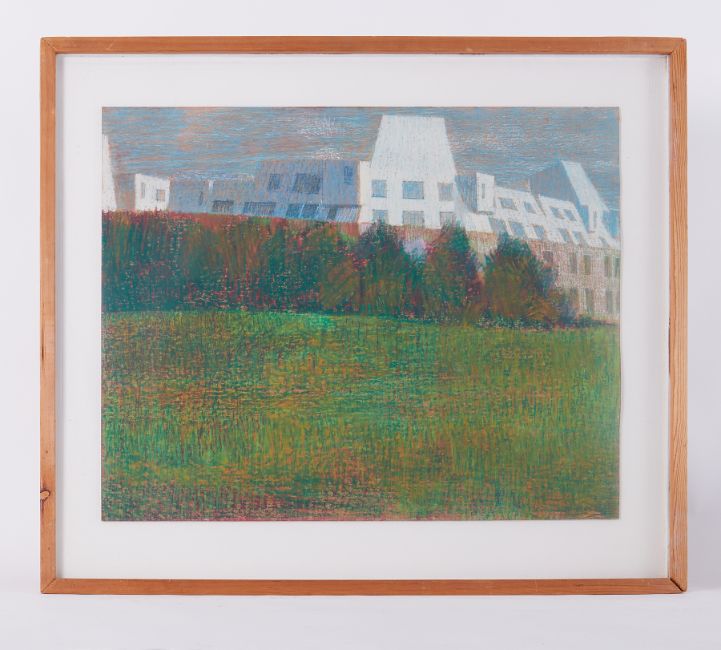 Glazed frame 'Grizedale College from Fields' c1981, pastel on board, 67 x 79cm.0