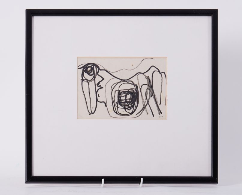 Framed painting titled 'Black and White Figurescape (6)' c.1963, mixed media on paper, 34cm x 37cm