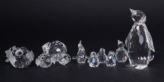 Swarovski Crystal Glass, a small collection of seven pieces including 'Penguins', 'Hermit Crab', 'Puffer Fish' etc, all boxed.