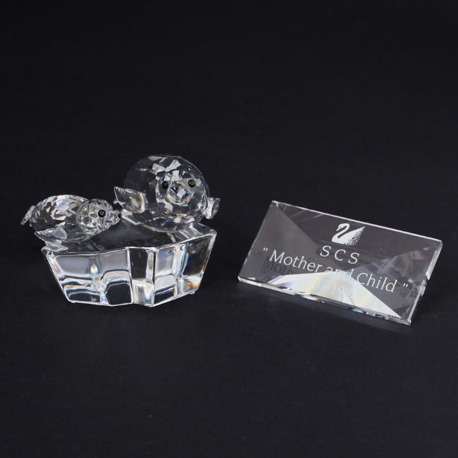 Swarovski Crystal Glass, Annual Edition 1991 'Save Me - The Seals' together with a plaque 'Mother & Child - 1990-1992', all boxed.