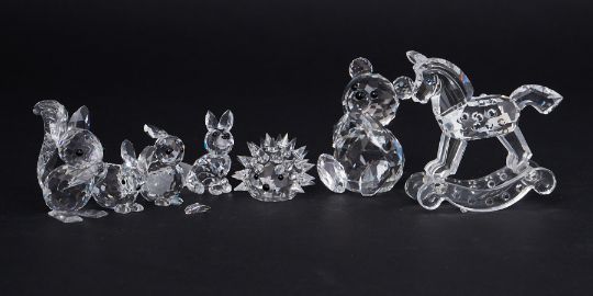 Swarovski Crystal Glass, a small collection of seven pieces including 'Hedgehog', 'Fox', 'Rocking Horse' etc, all boxed (some damage).