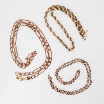 A 9ct gold 26" belcher chain, 7.58gm, a 9ct gold 17" twisted rope link style chain, 29.05gm and a 9ct gold 28" figaro & curb link chain, 47.40gm, (3)