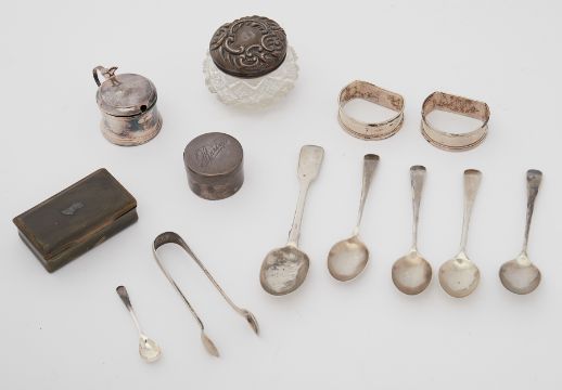 A mixed lot of silverwares to include five silver teaspoons & a silver mustard spoon, 2.45oz, a silver mustard pot with blue glass liner, 1.64oz, a pair of silver tongs and two silver napkin rings, 1.20oz, a silver lidded pot, 0.91oz, a glass dressing table jar with ornate silver lid and a snuff box.