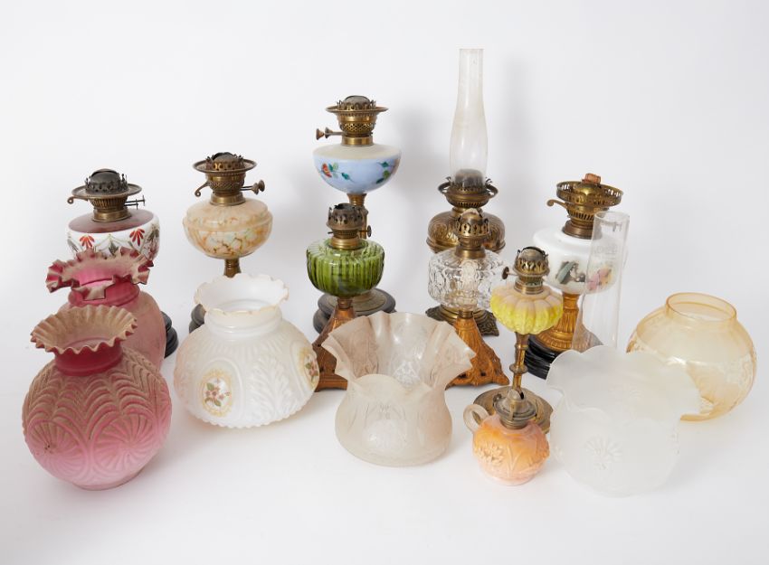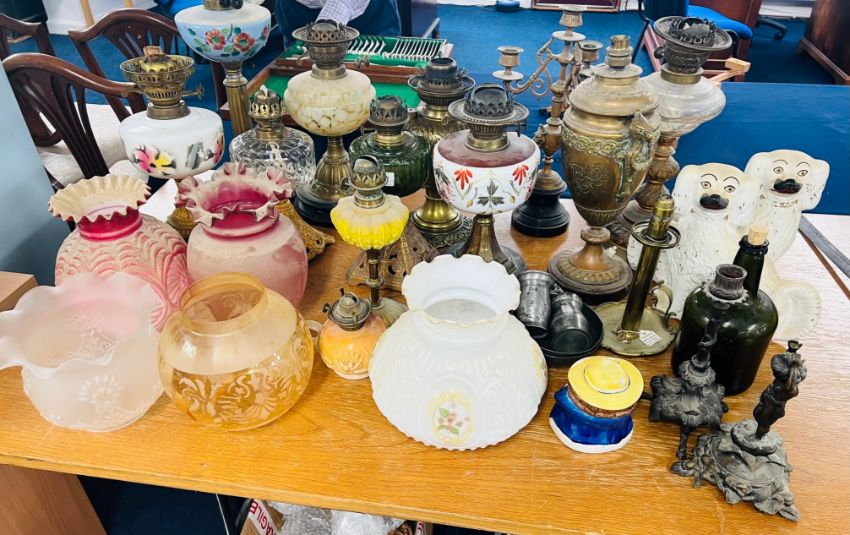 A collection of Victorian and later oil lamps coloured and other glass shades, ornate brass candelabra, chamber stick, pewter etc.