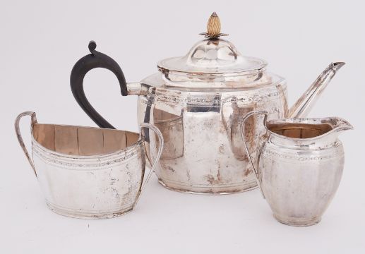A three piece silver tea service by the Goldsmiths & Silversmiths Company comprising of a teapot with decorative 'pineapple' lid finial, 18.26oz, a milk jug, 4.27oz & a two handles sugar bowl, 5.84oz, all with a decoratively engraved edge & hallmarked Sheffield, 1922-23, (3).