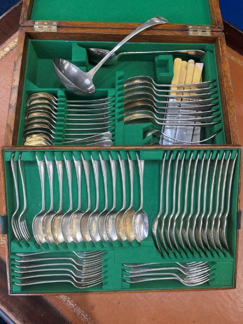 A mixed set of George V silver flatware, 60 pieces together with associated knives, weight approx 128oz, mixed dates circa 1913 to 1916, Hanoverian & Old English Pattern, fitted oak box with recessed military handles 46cm x 31cm, Sheffield, Maker JDWD.(James Deakin & Sons, John & William F Deakin)