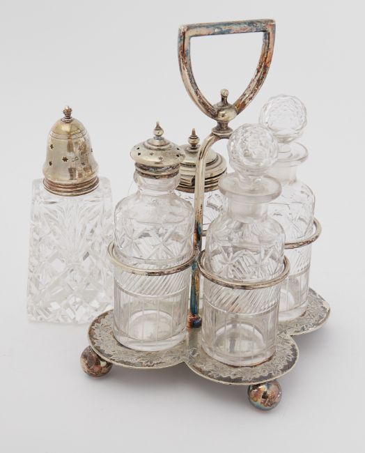 A silver plated & cut glass cruet set, total weight 33.94oz and a silver & cut glass sugar shaker, (silver lid weighs 0.50oz), (2).