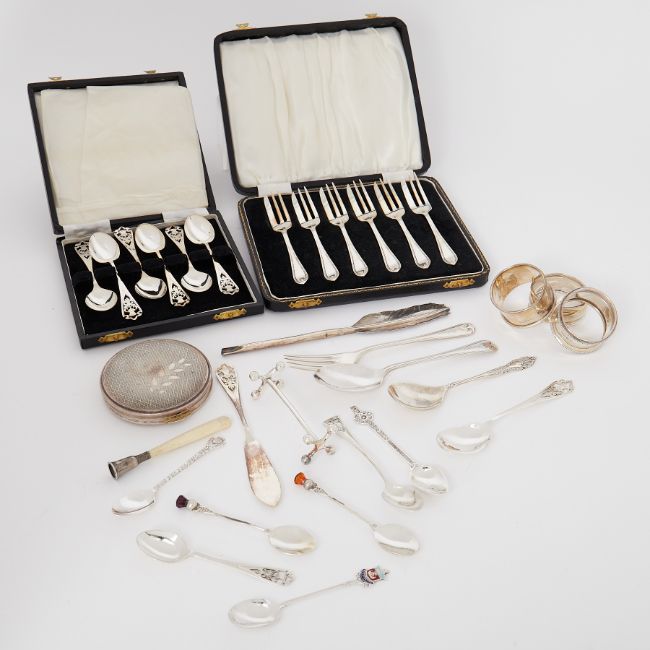 A mixed lot of silver items to include napkin rings, compact, spoons, fork etc, total weight 9.05oz, a boxed set of silver teaspoons with thistle designed handles, 2.20oz and a boxed set of silver dessert forks, 3.27oz.