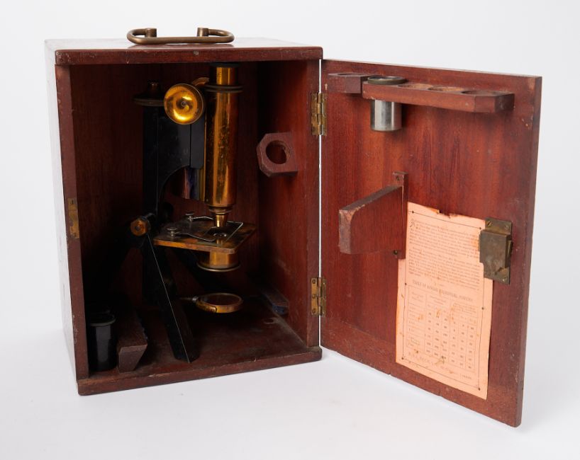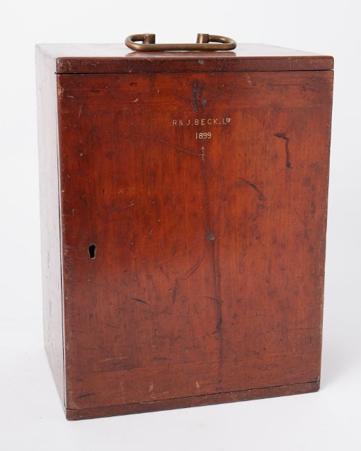 A boxed microscope marked R & J Beck of London.