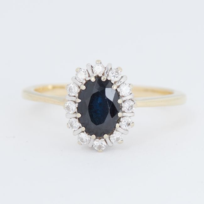 An 18ct yellow & white gold cluster ring set with a central oval cut dark blue sapphire and surrounded by small round cut diamonds, 2.86gm, size M 1/2.