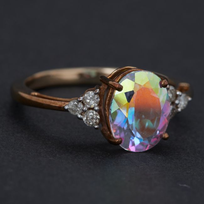 A 9ct yellow gold ring set with 3,13 carats of oval cut mystic topaz with a trefoil of round cut diamonds to each side, total diamond weight 0.19 carats, 2.85gm, size R 1/2, comes with an Authenticity Certificate from Gems TV.