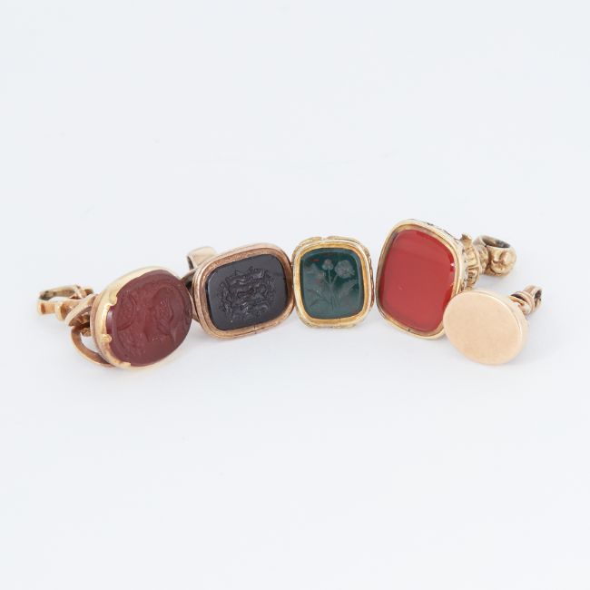 A collection of five yellow gold fob seals (only one marked with 15ct), set with bloodstone, carnelian, etc, (four not hallmarked & not tested), total weight 20.48gm.