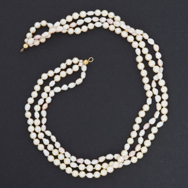 A triple row of pearls of varying shapes and colours from cream to pink, approx. 16", round pearls measuring approx. 6mm, strung to gold ball ends but no clasp, 52.60gm.