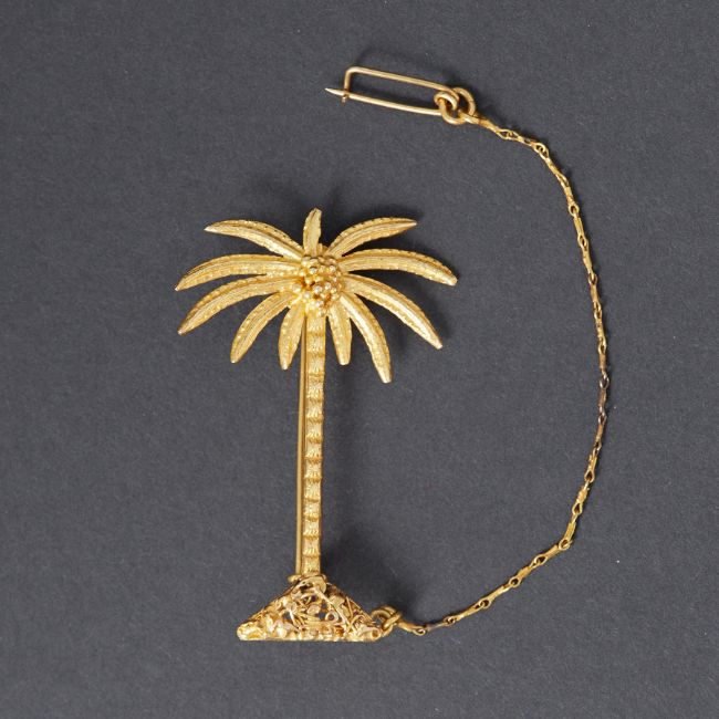A yellow gold palm tree brooch with textured and embossed decoration & a safety chain, (not hallmarked but assessed as 21ct gold), 45.50mm x 29.00mm, 7.00gm, comes with a photocopy of a new replacement valuation 2016 for £795 and a photocopy of the original receipt dated 17th August 1957 with a Nigeria stamp.