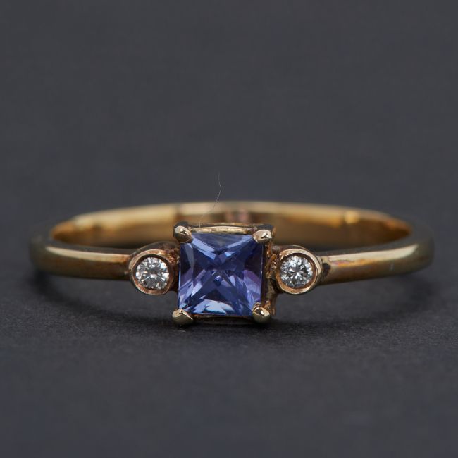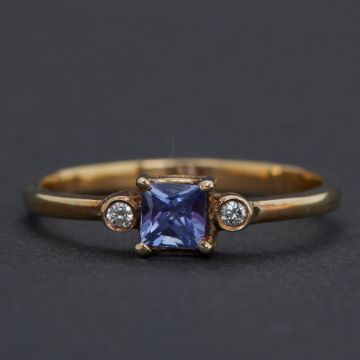 An 18ct yellow gold ring set with a princess cut tanzanite, approx.0.30 carats with a round brilliant cut diamond set to each side, total weight approx. 0.02 carats, 1.59gm, size L 1/2 to M, (not hallmarked & not tested), comes with a photocopy of a Certificate of Guarantee from Crafts Shop Ltd, Mombasa, dated 15/6/2011.