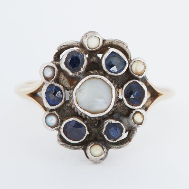 An Arts & Crafts yellow gold & white metal ring set with small round cut sapphires & pearls, the head setting measures approx. 1.5cm x 1.3cm, 3.80gm, size R, (not hallmarked or tested).