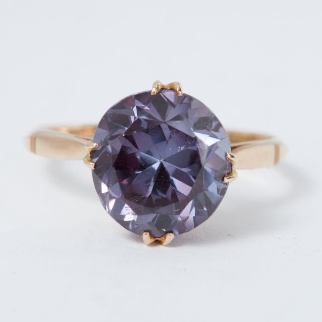 A yellow gold ring set with a round cut Alexandrite, approx. 4.40 carats 2.83gm, size M 1/2, (hallmark indistinct).
