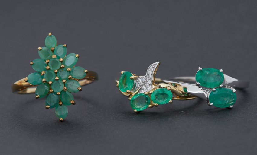 Three rings to include a 9ct white gold ring set with 1.27 carats of Zambian oval cut emeralds, 2.40gm, size R 1/2, a 9ct yellow gold marquise shaped cluster ring set with 2.58 carats of Colombian emeralds, 2.47gm, size R and a 9ct yellow gold ring set with 1.08 carats of Colombian emeralds & 0.06 carats of white zircon, 2.13gm, size R 1/2, (3), each come with a Authenticity Certificate from Gemporia.