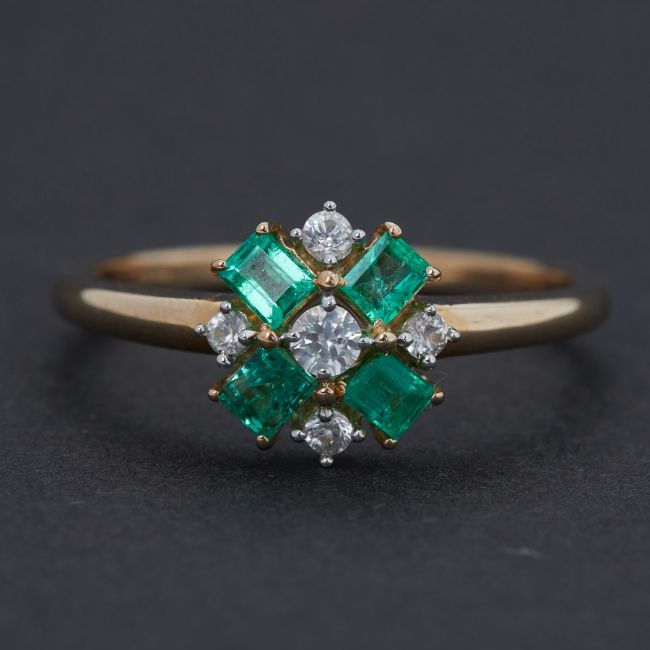 A 9ct yellow gold ring set with four baguette cut Colombian emeralds, total weight 0.46 carats interspaced by 0.19 carats of white sapphire, 2.00gm, size P 1/2, comes with an Authenticity Certificate from Gemporia.