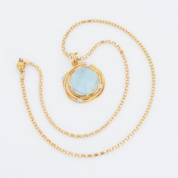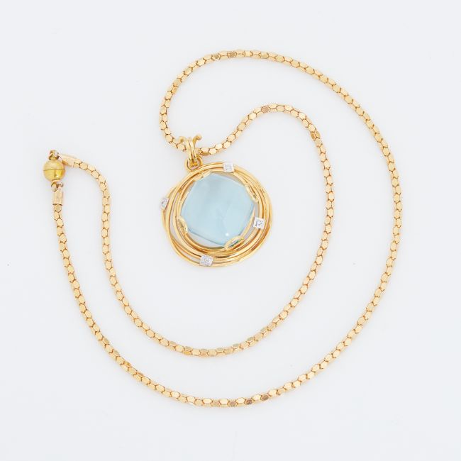 An 18ct yellow gold abstract style pendant set with a square cut cabochon blue topaz, measuring approx. 18mm diameter, with four small round brilliant cut diamonds in the setting, on an 18ct yellow gold fancy link chain (stamped 700), with a magnetic clasp, 18", total weight 22.62gm.