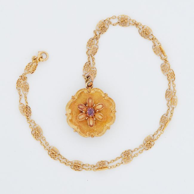 A yellow gold Georgian flower & scroll design locket set with a central oval cut ruby and on the reverse a letter, diameter approx. 2cm, (not hallmarked or tested), on a 15ct yellow gold 16" filigree design chain, total weight 11.85gm.