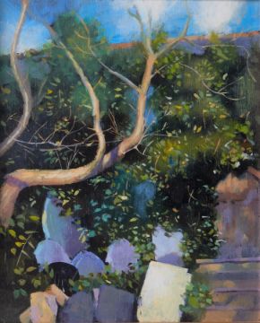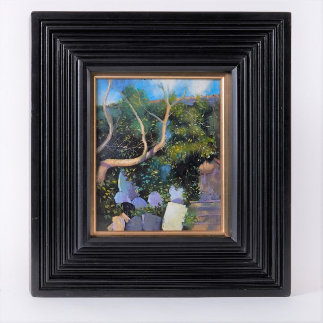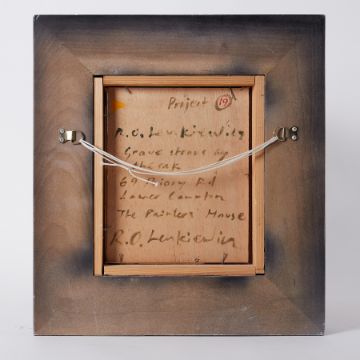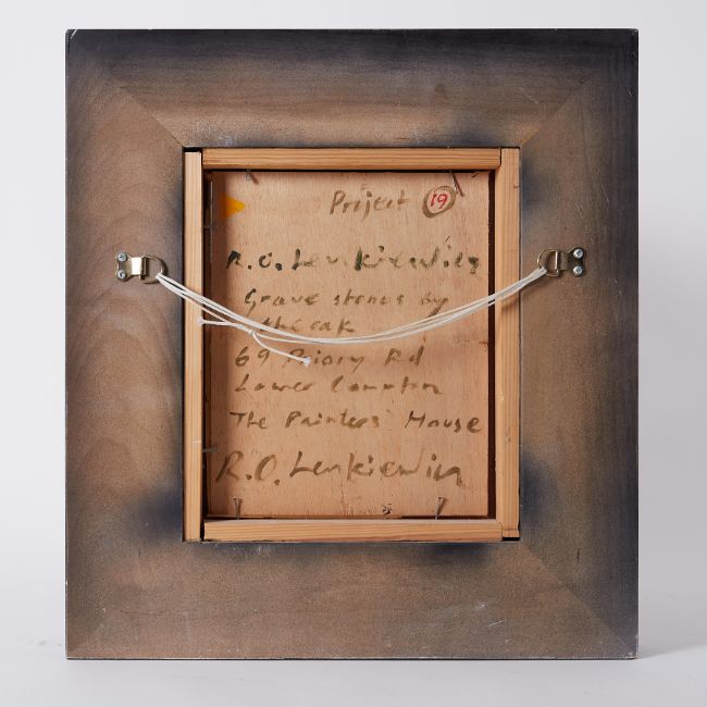 Robert Lenkiewicz (1941-2002) 'Grave Stones by the Oak, 69 Priory Road, Lower Compton, The Painters House' Project 19, oil on board, titled and signed twice to the reverse, 25cm x 21cm, overall size 47cmx 43cm, framed and glazed. This energetic, fresh and bright painting is full of atmosphere. Lenkiewicz was most relaxed painting at his own home. By a quirk of fate or serendipity this beautiful piece has become most important and valued due to the fact that beneath the oak is where The Painter now rests. He is buried beneath the oak at Lower Compton.