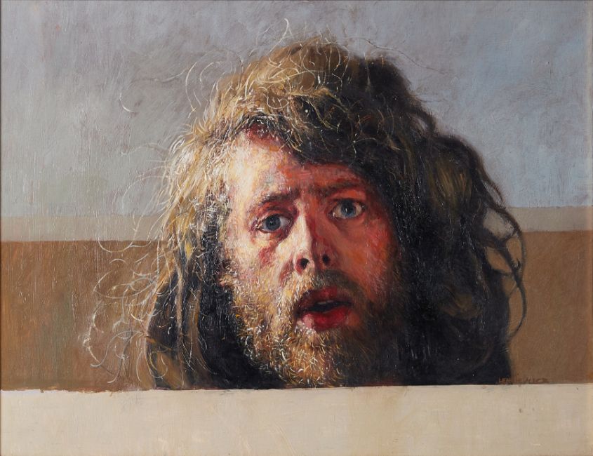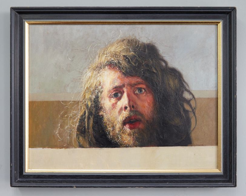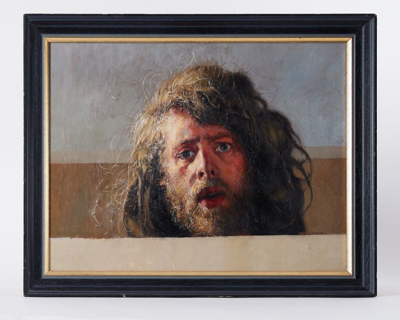 Robert Lenkiewicz (1941-2002) signed oil painting, 'Self Portrait', framed, 34cm x 45cm, overall size 42cm x 53cm. Provenance -acquired directly from the artist by the sellers family, circa 1977, possibly painted as part of Section Five of the Relationship Series 'Love & Mediocrity' (two self portraits are listed amongst the works from the project, numbers 9 and 10).