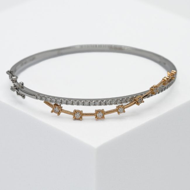 An 18ct white gold bangle with a rose gold twist, set with a total weight of 0.96 carats of round brilliant cut diamonds, oval in shape, inner diameter of bangle approx. 5.7cm, push in clasp & two figure of eight safety catches, 9.96gm.