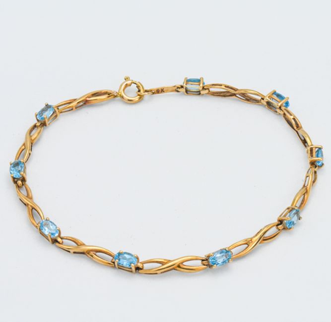 A 9ct yellow gold fancy twist Blue Topaz bracelet set with nine oval topaz's, approx weight 4.2g, length approx 19cm.