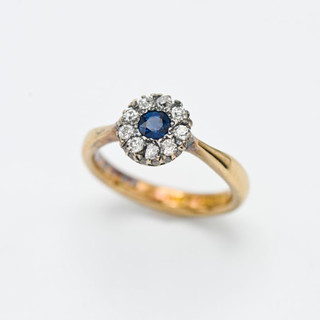 An 18ct diamond and sapphire cluster ring, size K.