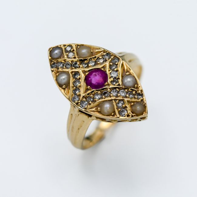 A 15ct yellow gold ruby, diamond and pearl marquise shaped ring, centre ruby approx 20 points with six round pearls and twenty eight round brilliant cut diamonds approx 2 points each, total diamond weight approx 56 points, size N.